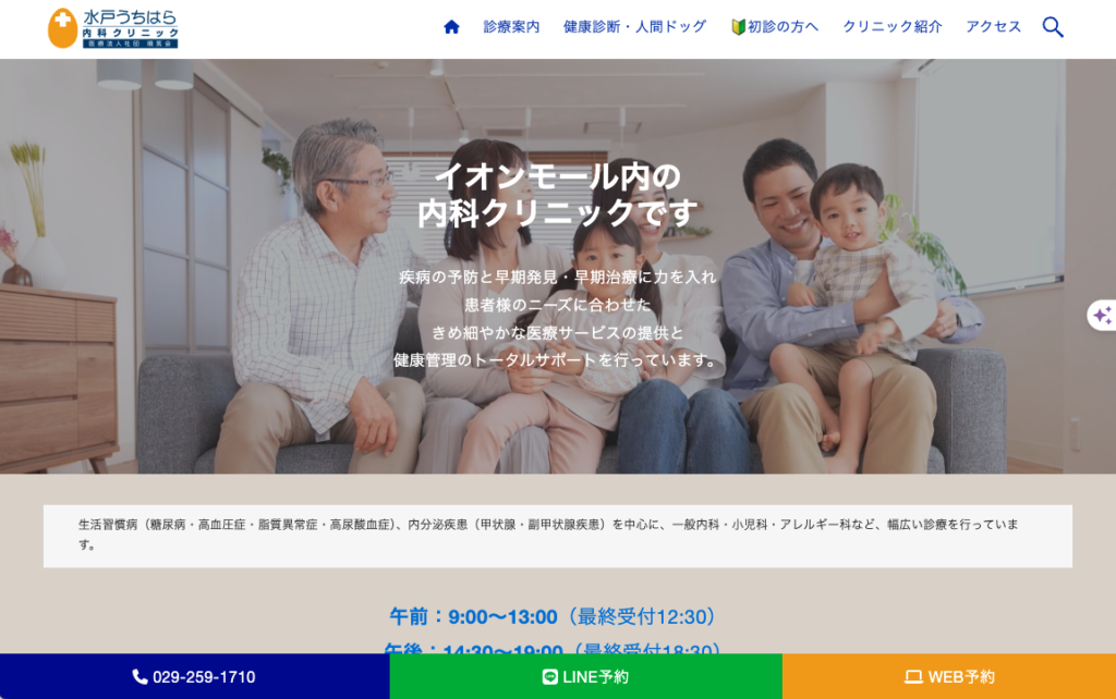 イオンモール水戸内原内の医療モールにある内科クリニックのサイト企画制作、院内システム機器選定、予約システム導入サポート。